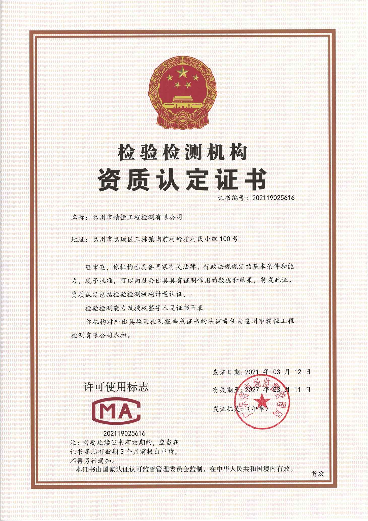 2021年3月12日,我司取得广东省市场监督管理局颁发的检验检测机构资质认定证书,同年6月10日取得惠州市住房和城乡建设局颁发的建设工程质量检测机构资质证书。主要检测范围:建筑工程材料检测、建筑门窗工程检测、装饰装修材料检测、主体结构工程检测、市政工程现场检测、建筑电气检测、建筑节能检测等。